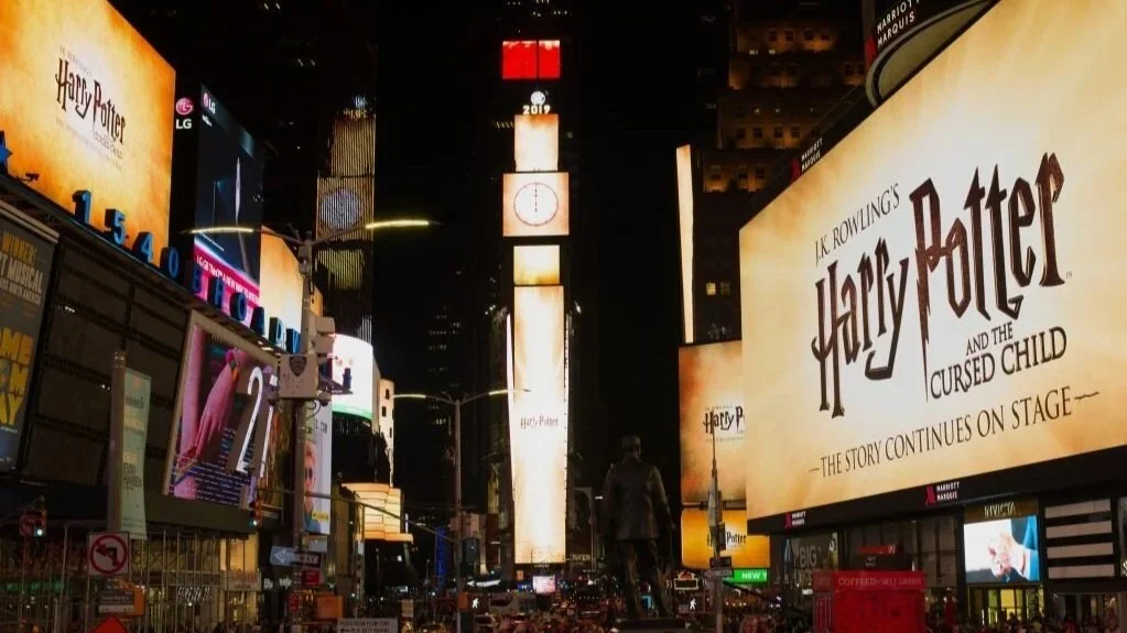 Harry Potter and the Cursed Child historic Times Square takeover, seamlessly synchronizing content across multiple screens between 43rd to 47th streets. The objective was to fully immerse and engage the audience below during a high-profile activation with J. K. Rowling.